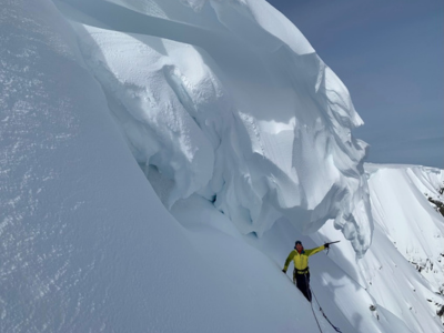 Cornices are overhanging snow structures formed by windblown snow. They will release naturally during storm cycles, often releasing any unstable windslab below. They can also be released by additional load (an unaware person standing on them) or during a period of warming.